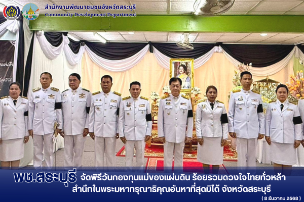 สำนักงานพัฒนาชุมชนจังหวัดสระบุรี นำโดย นายวิลาศ บุญโต พัฒนาการจังหวัดสระบุรี จัดพิธีวันกองทุนแม่ของแผ่นดิน ร้อยรวมดวงใจไทยทั่วหล้า สำนึกในพระมหากรุณาธิคุณอันหาที่สุดมิได้ จังหวัดสระบุรี โดย นายบัญชา เชาวรินทร์ ผู้ว่าราชการจังหวัดสระบุรี เป็นประธานในพิธีฯ พร้อมด้วย นายทินกร บุญเงิน รองหัวหน้าผู้ตรวจราชการ กรมการพัฒนาชุมชน ปฏิบัติหน้าที่ ผู้อำนวยการศูนย์ศึกษาและพัฒนาชุมชนสระบุรี, หัวหน้าส่วนราชการระดับจังหวัดและอำเภอ, ผู้อำนวยการกลุ่มงาน, พัฒนาการอำเภอ, เจ้าหน้าที่พัฒนาชุมชน และเครือข่ายกองทุนแม่ของแผ่นดินจังหวัดสระบุรี เข้าร่วมพิธี ทั้งสิ้นจำนวน 210 คน