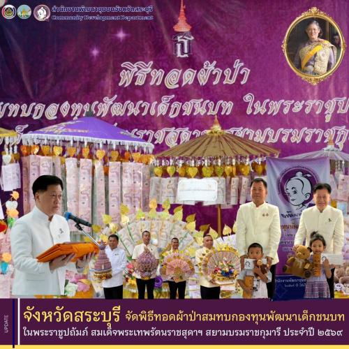 จังหวัดสระบุรี จัดพิธีทอดผ้าป่าสมทบกองทุนพัฒนาเด็กชนบท ในพระราชูปถัมภ์ สมเด็จพระเทพรัตนราชสุดาฯ สยามบรมราชกุมารี ประจำปี 2569 โดยมี นายบัญชา เชาวรินทร์ ผู้ว่าราชการจังหวัดสระบุรี เป็นประธานในพิธีฯ ทั้งนี้ ได้รับความเมตตาจากพระราชวชิรมงคลวิสิฐ เจ้าคณะจังหวัดสระบุรี เจ้าอาวาสวัดมงคลชัยพัฒนา พระอารามหลวง เป็นประธานฝ่ายสงฆ์ โดยมีนายอำเภอแก่งคอย, หัวหน้าส่วนราชการ, ข้าราชการ, กำนัน ผู้ใหญ่บ้าน, ภาคีเครือข่ายภาครัฐ, ภาคเอกชนและประชาชนเข้าร่วมพิธีฯ