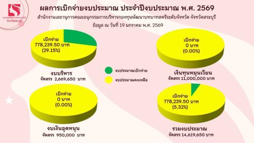 - รายงานผลการเบิกจ่ายงบประมาณตามแผนการดำเนินงานและแผนการใช้จ่ายงบประมาณกองทุนพัฒนาบทบาทสตรี ของสำนักงานเลขานุการคณะอนุกรรมการบริหารกองทุนพัฒนาบทบาทสตรีระดับจังหวัด จังหวัดสระบุรี ประจำปีงบประมาณ พ.ศ. 2569