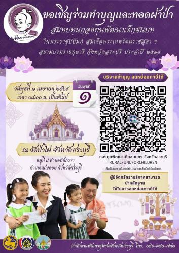 ทั้งนี้ สำนักงานพัฒนาชุมชนจังหวัดสระบุรี ขอเชิญชวนผู้มีจิตศรัทธา หน่วยงานภาครัฐ ภาคเอกชน และประชาชนทั่วไป ร่วมสมทบทุนทอดผ้าป่ากองทุนพัฒนาเด็กชนบท ในพระราชูปถัมภ์ สมเด็จพระเทพรัตนราชสุดาฯ สยามบรมราชกุมารี จังหวัดสระบุรี ประจำปี 2569 เพื่อร่วมกันสร้างโอกาสที่ดีให้แก่เด็กและเยาวชนในพื้นที่จังหวัดสระบุรี โดยสามารถร่วมบริจาคตาม QR Code หรือสอบถามรายละเอียดเพิ่มเติมได้ที่สำนักงานพัฒนาชุมชนจังหวัดสระบุรี โดยผู้มีจิตศรัทธาบริจาคสามารถนำหลักฐานไปใช้ในการลดหย่อนภาษีได้ ซึ่งการมีส่วนร่วมของทุกภาคส่วนในครั้งนี้จะเป็นพลังสำคัญในการขับเคลื่อนการพัฒนาคุณภาพชีวิตเด็กและเยาวชนให้เติบโตอย่างมีคุณภาพ และนำไปสู่ความเข้มแข็งของชุมชนอย่างยั่งยืนต่อไป